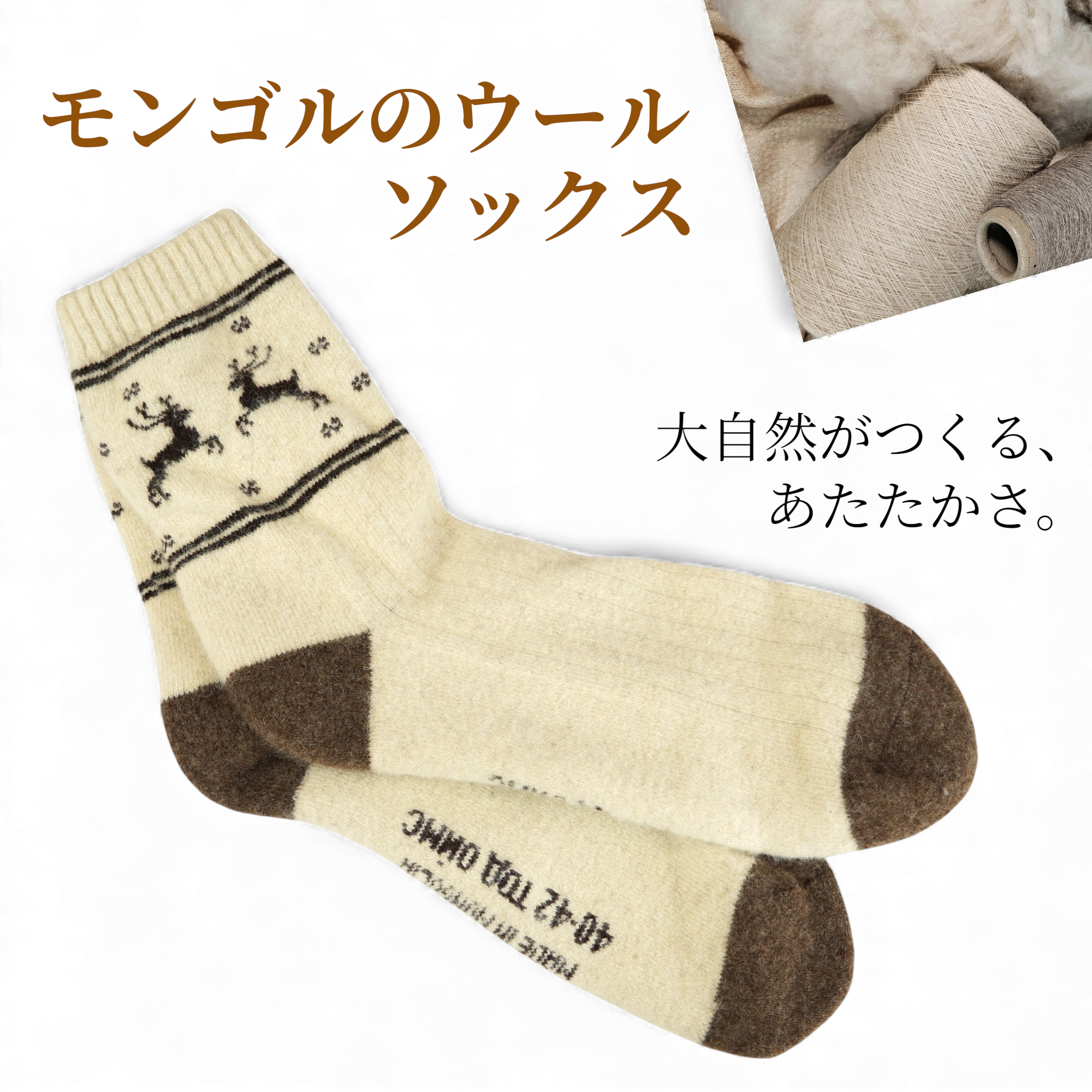 ・モンゴル産の高品質ウールを使用した、肌触りの良いソックスです。