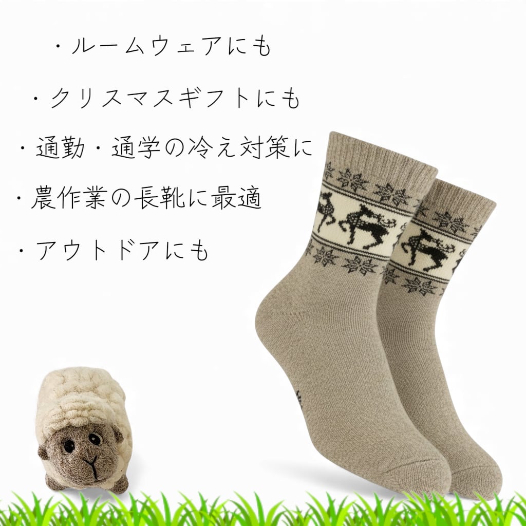 寒い冬にぴったりのモンゴルウールソックスで、温かな足元を実現しましょう。モンゴルの厳しい寒さを耐え抜くために作られたこのソックスは、寒さが厳しい地域で育まれた高品質のウールを使用しています。そのため、ブランケットのような心地よさを持ちながらも、洗濯後の型崩れが少なく、耐久性にも優れています。お家の中でリラックスする時はもちろん、アウトドアや農業など、アクティブなシーンでも大活躍するアイテムです。また、ユニークなデザインに加え、鹿の印があしらわれており、特別な贈り物としても最適です。クリスマスプレゼントやお世話になった方へのギフトにも喜ばれることでしょう。